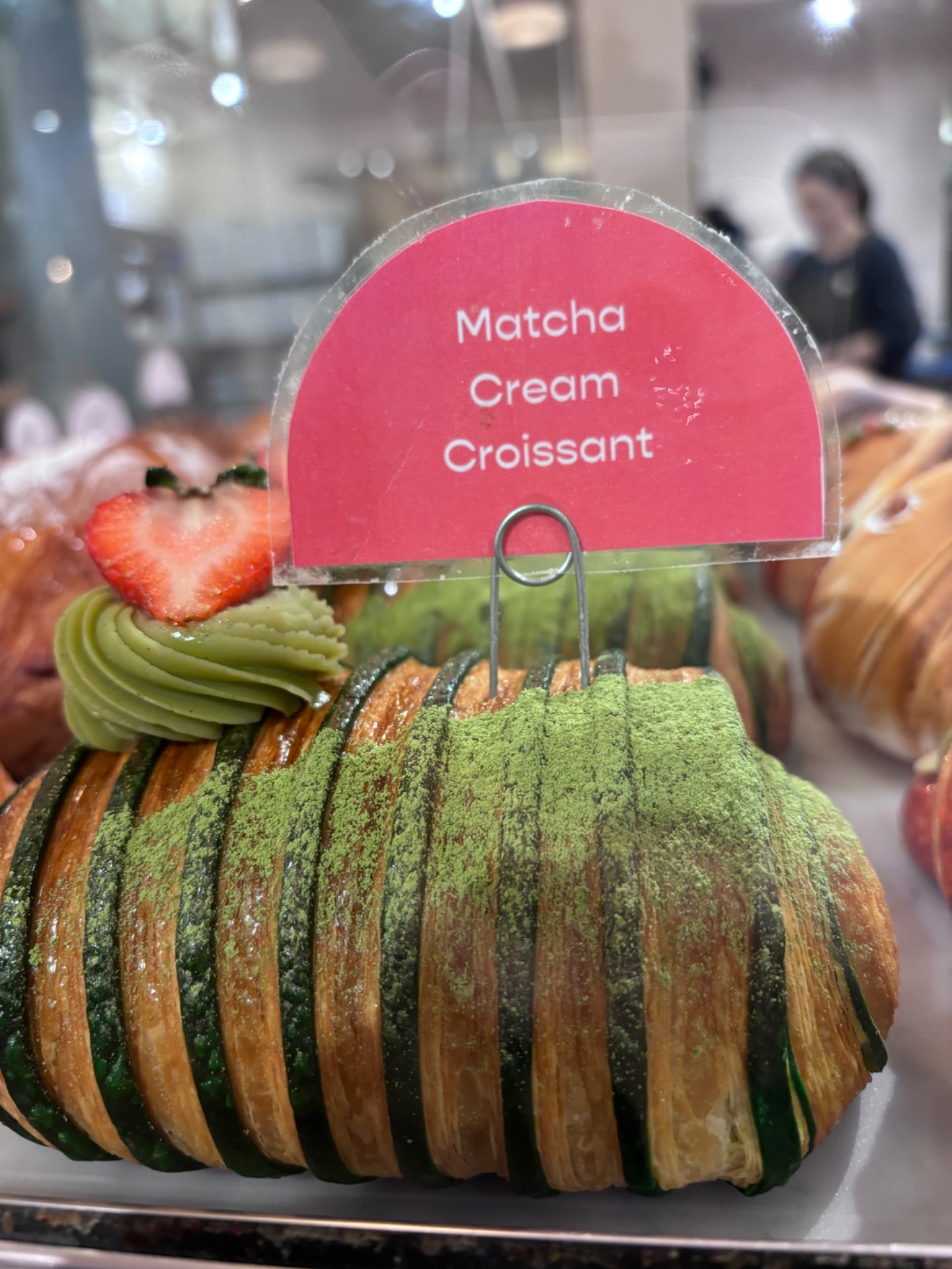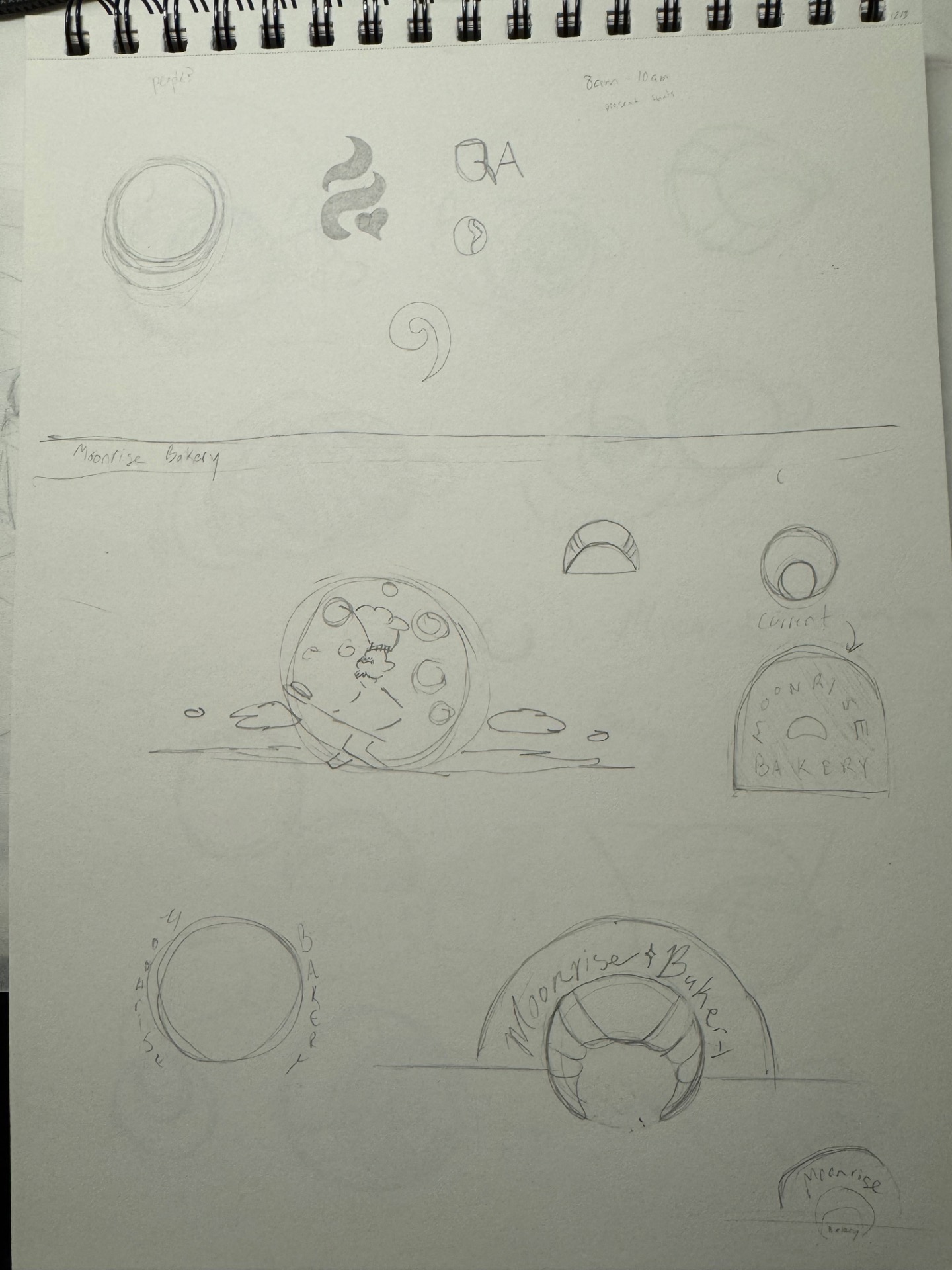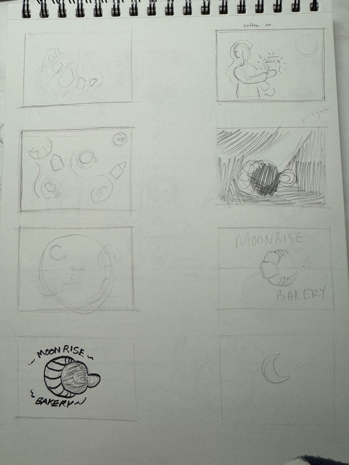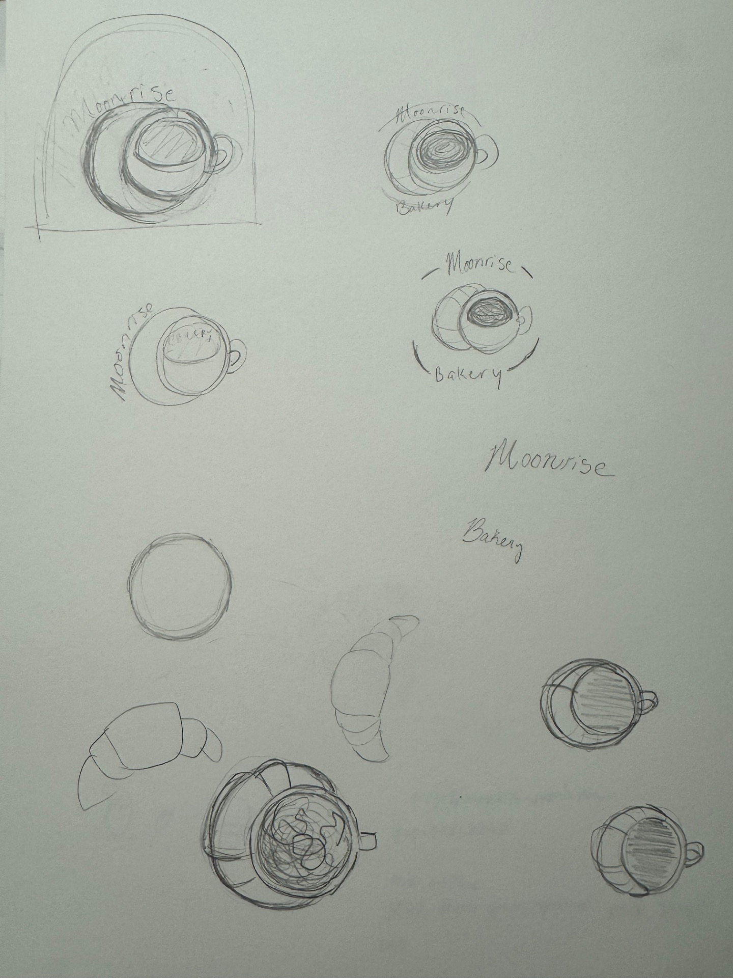 Kate created the layout for the design in the drawing app Procreate. She sent it to me and I traced over it in Adobe to make it a vector image. I had a few of my own ideas and ran them by Kate before adding them in. One of my ideas was making the points of the croissant logo sharper so it resembled a moon. I also added red outlines of products inside the bubble shapes to create contrast.