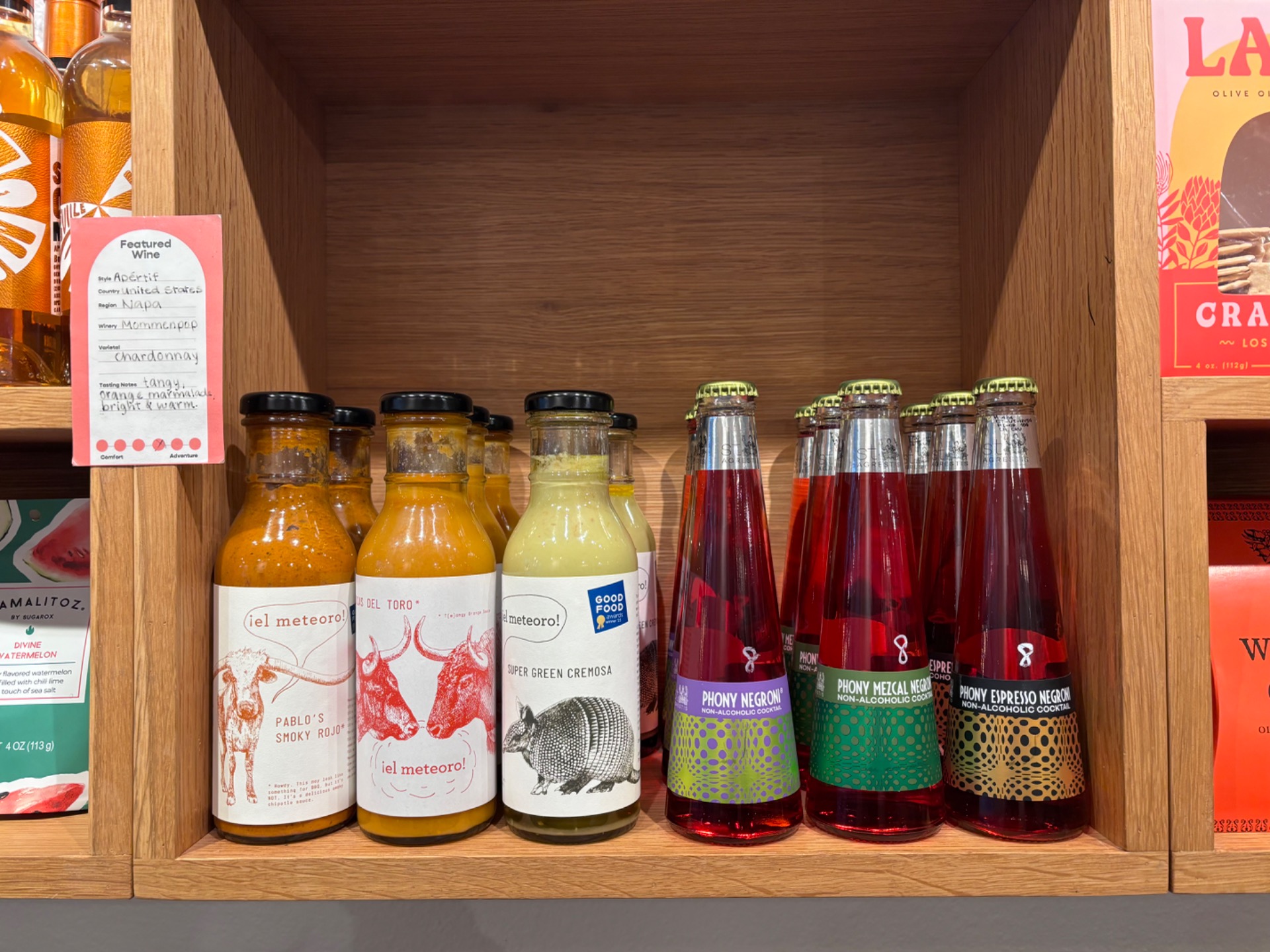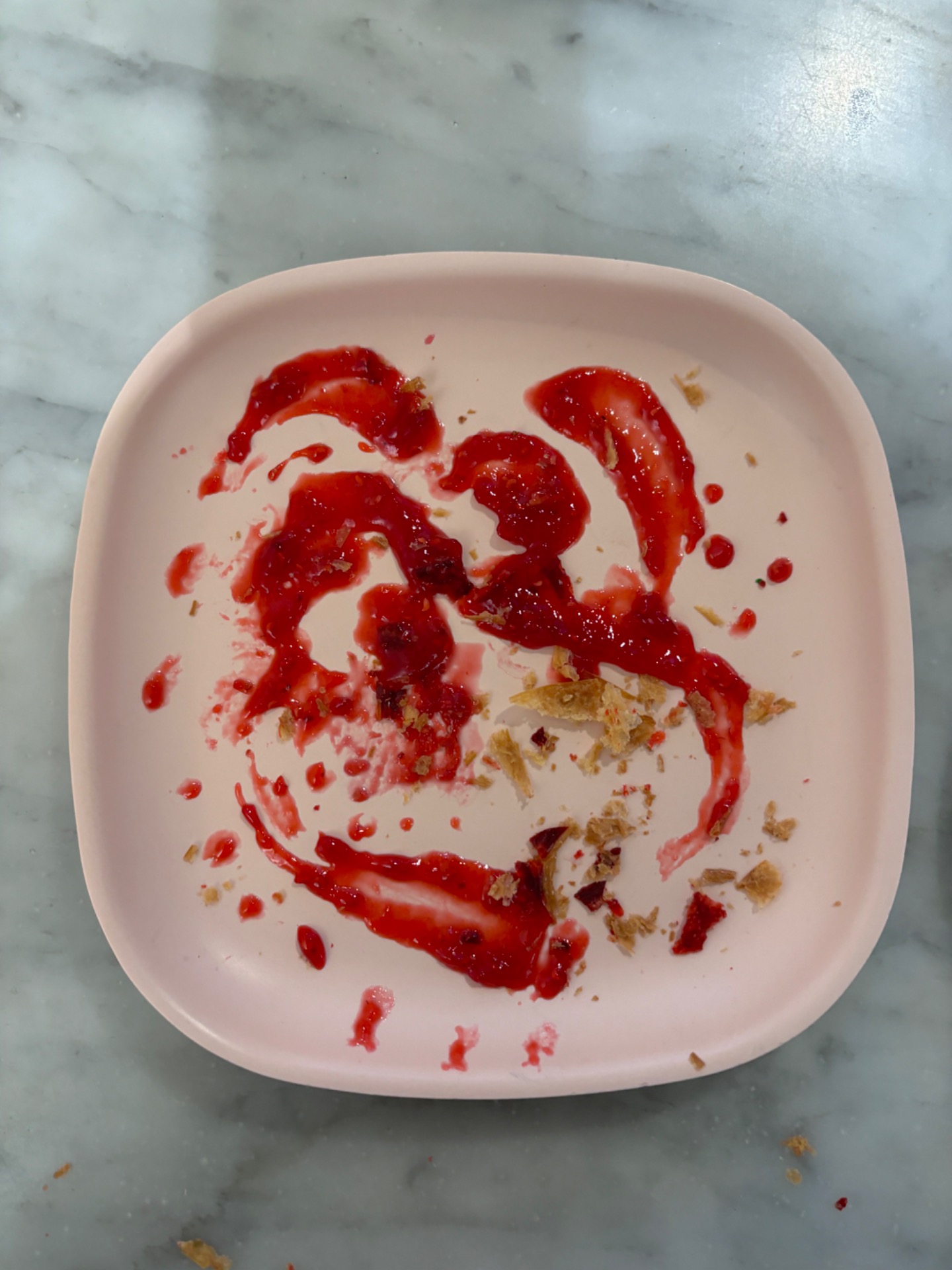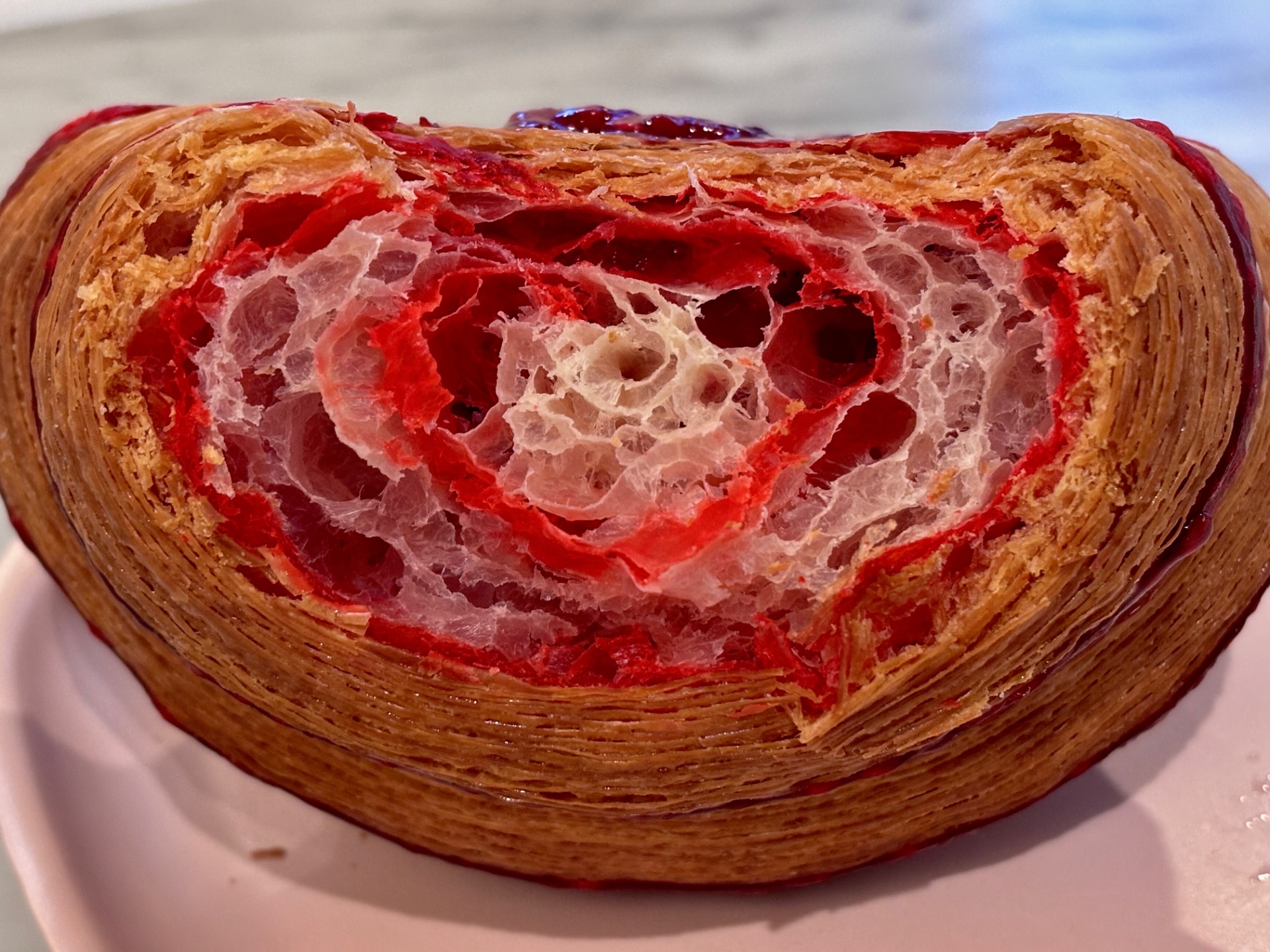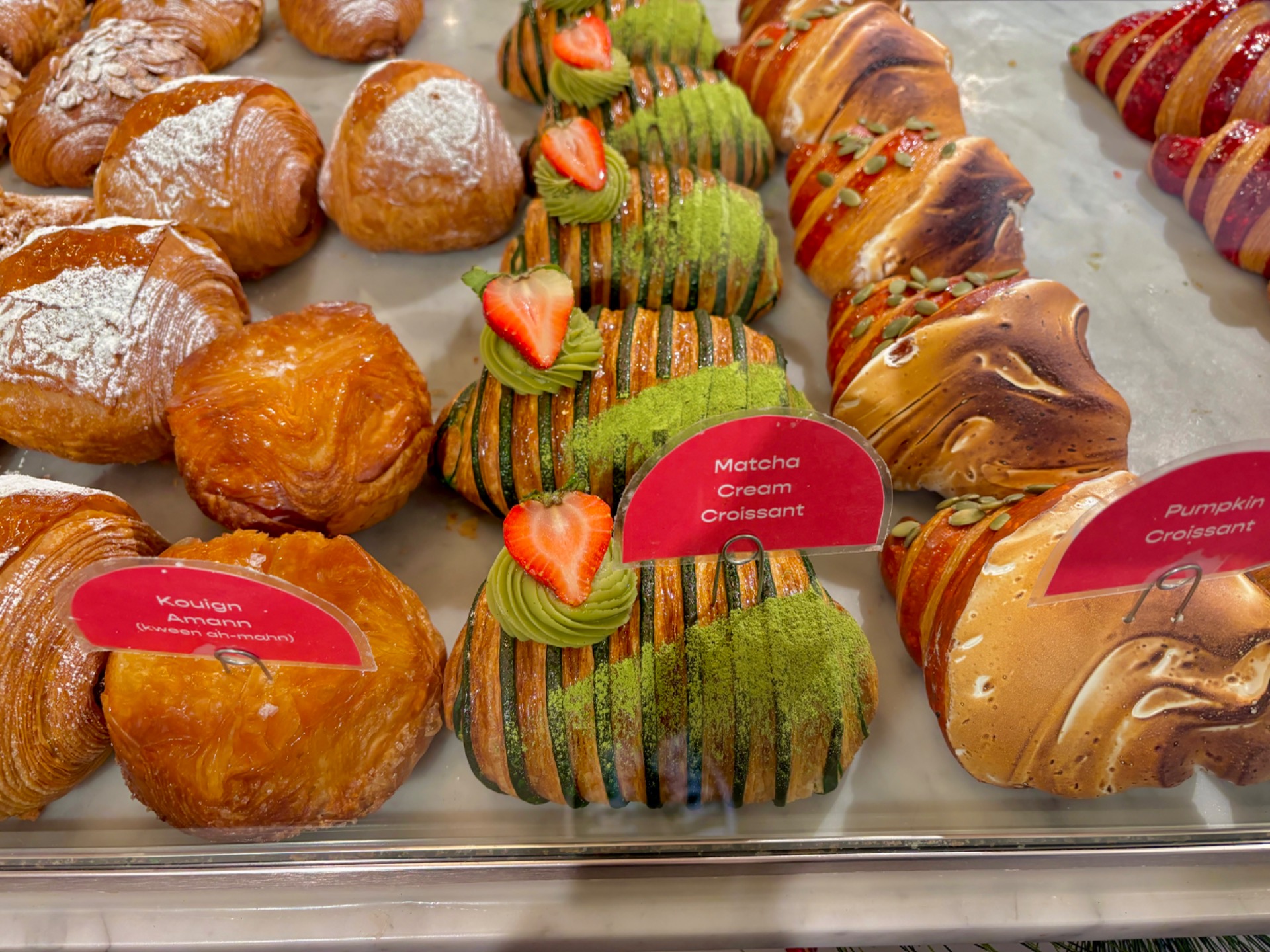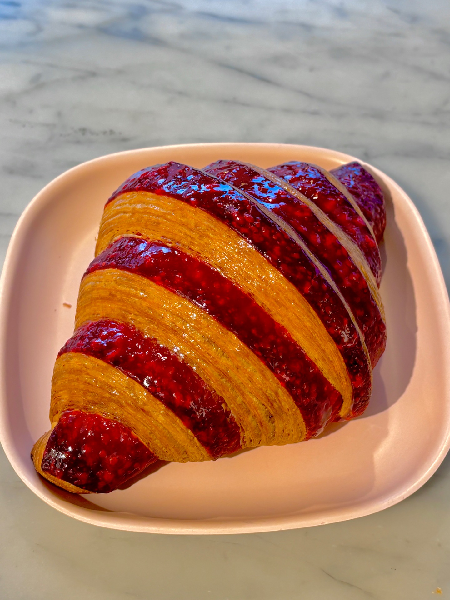 Kate created the layout for the design in the drawing app Procreate. She sent it to me and I traced over it in Adobe to make it a vector image. I had a few of my own ideas and ran them by Kate before adding them in. One of my ideas was making the points of the croissant logo sharper so it resembled a moon. I also added red outlines of products inside the bubble shapes to create contrast.